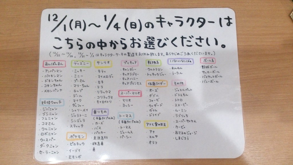 キャラクターケーキは、クリスマス、年末年始期間(12/22~25、12/31~1/2)はお休みさせて頂きます。