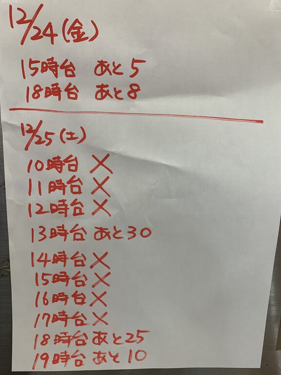 12/24(金)のご予約もだいぶ埋まってきました。