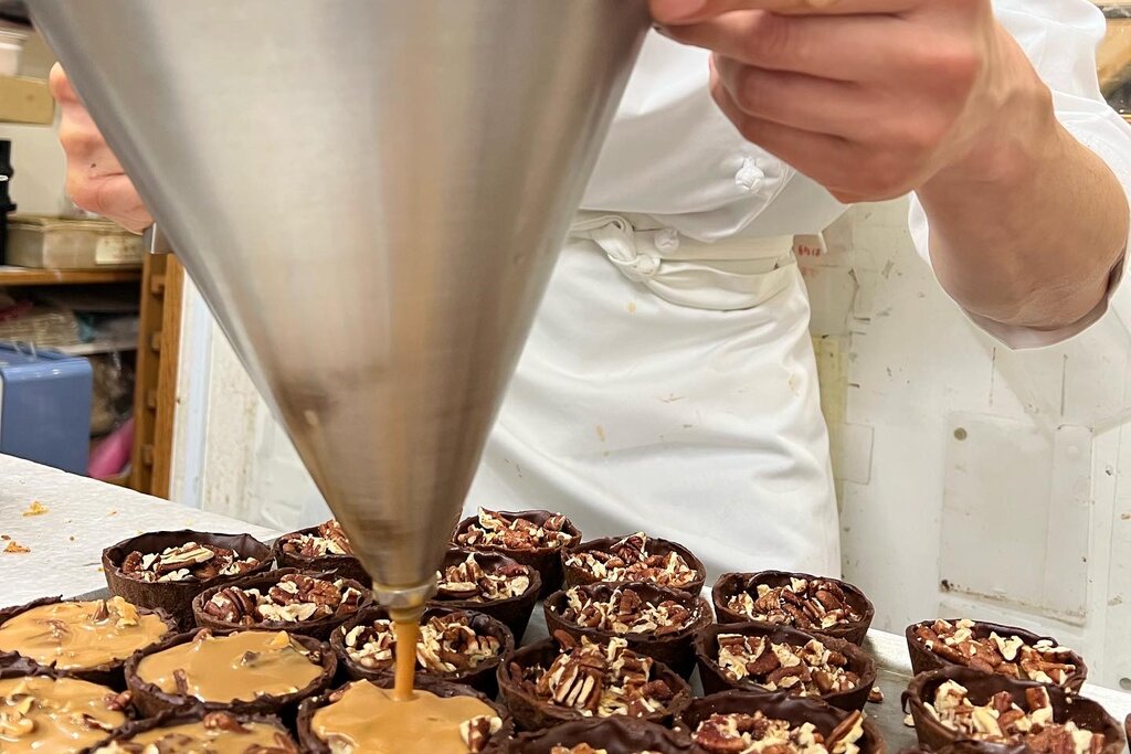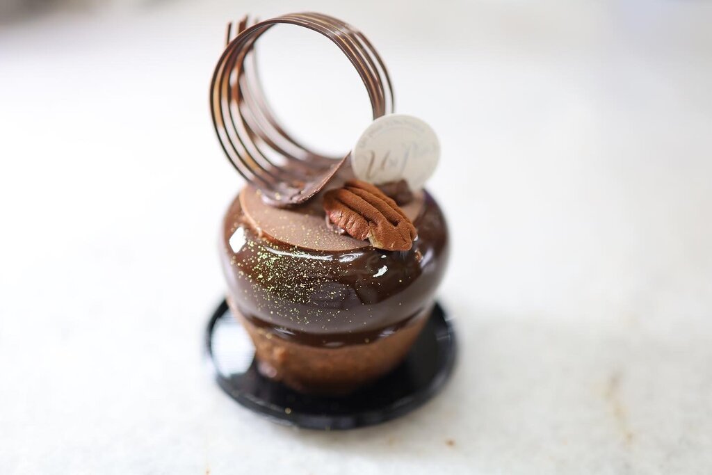 下のタルト台の中はローストしたピーカンナッツとキャラメルクリーム、上のチョコレートムースの中に柔らかなバニラのババロアを入れております。